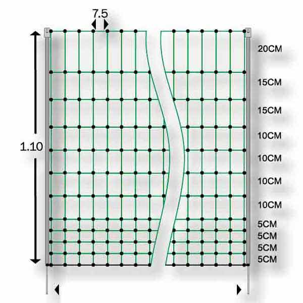 - 12 horizontal wires spaced from 5.9cm at the bottom up to 23.5cm at the top (bottom string is not electrified)
